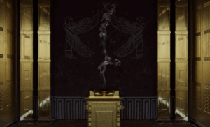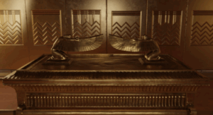 Candles flicker. Incense swirls. The Ark of the Covenant glows in the dim light.